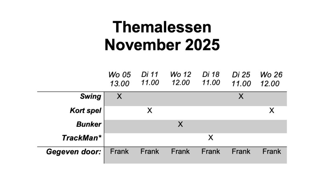 In april gaan de themalessen weer van start. Een laagdrempelige manier om aan een specifiek deel van je golfspel te werken en een kans om nieuwe mensen te leren kennen. Hieronder het schema aan themalessen voor de maand april: